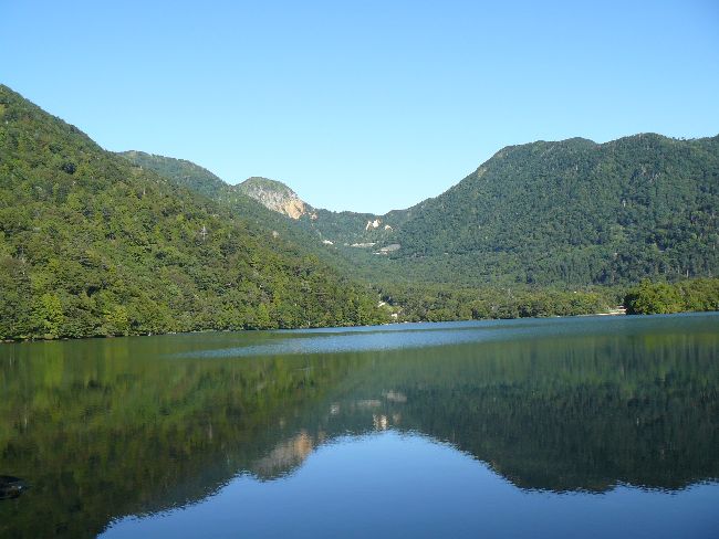 湯ノ湖(日光市)概要: 湯ノ湖は三岳(標高:1944.8m)の火山噴出物 で湯川が堰き止められて形成された堰止湖です。標高1478m、面積0.4〜0.5ku、周囲2.2km、最大深度12.5mほどで東岸には兎島半島が突き出し北側には湯ノ湖の名称の由来となった温泉が湧き出ていています。温泉の発見は延暦7年(788)、勝道上人が日光を開いた際見つけたのが始まりとされ、文政年間(1818〜1830)に編纂された「日光山志」には中禅寺温泉八湯と記載され、明治時代に編纂された「古事類苑」には日光温泉として紹介されています。特に硫黄の含量が多い事でも知られ万座温泉(群馬県嬬恋村)、月岡温泉(新潟県新発田市)、高湯温泉(福島県福島市)に次ぐ硫黄温泉で昭和29年(1954)には酸ヶ湯温泉(青森県青森市)、四万温泉(群馬県中之条町)と共に国民保養温泉地に指定されています。湯ノ湖の南には湯滝があり、戦場ヶ原、竜頭の滝、中禅寺湖と続いています。